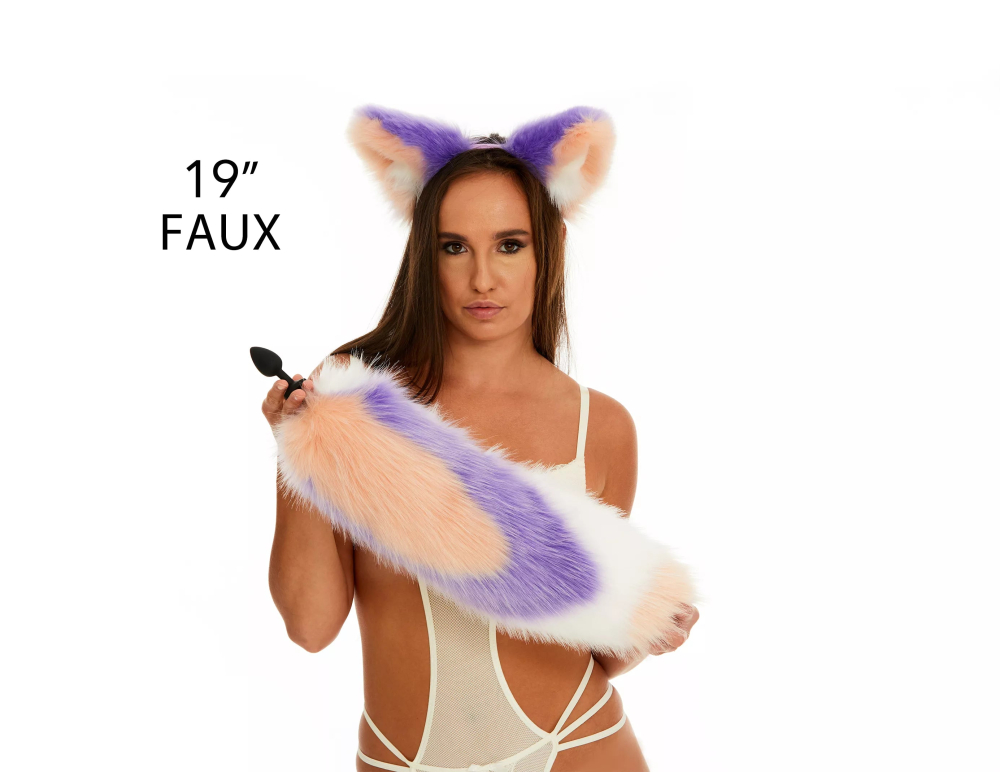 Анальный меховой хвост без пробки Трехцветный Персиковый фиолетовый белый с персиковым кончиком OKOVA 500 мм Avokado