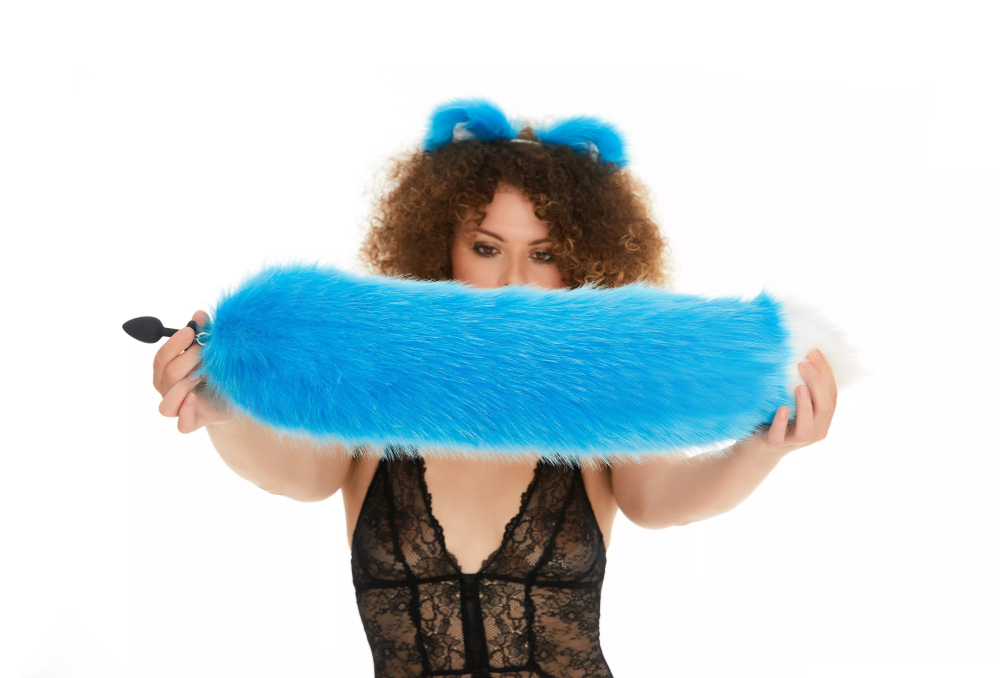 Анальный меховой пушистый хвост без пробки Ярко голубой с белым кончиком OKOVA 600 мм Avokado