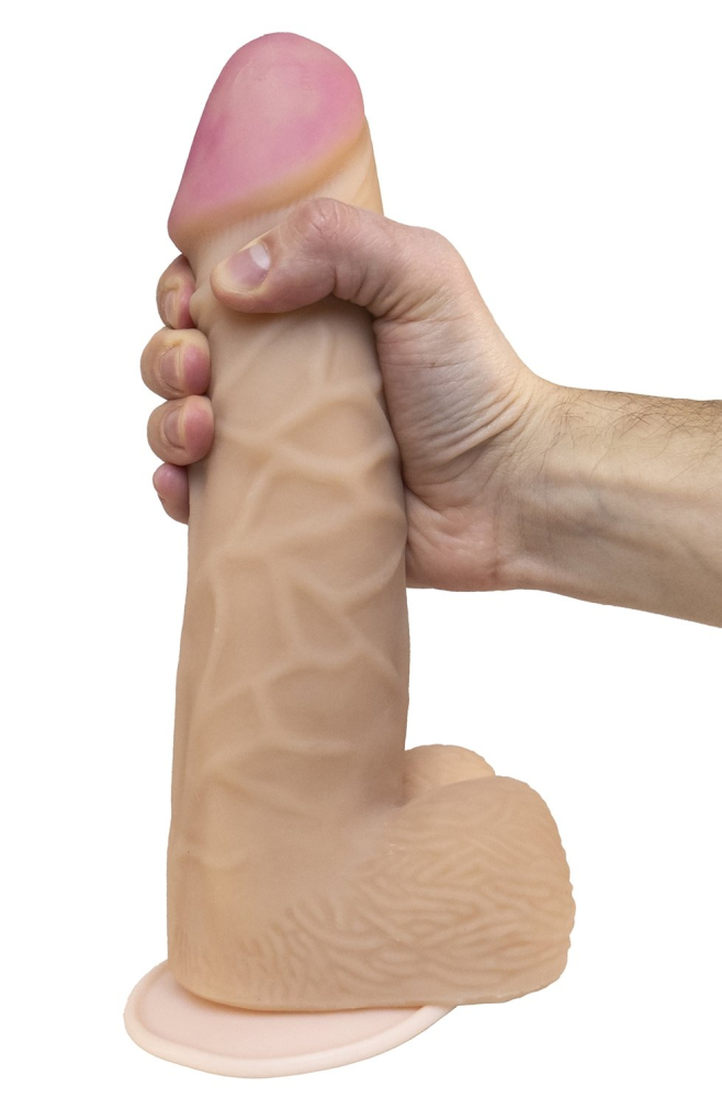 Огромный реалистичный фаллоимитатор телесного цвета на присоске. Имеет форму члена с мошонкой и ярко-выраженной розовой головкой. Необычайно приятный, упругий, рельефный, выполненный из Киберкожы, не имеет швов. Имеет ребристую поверхность для дополнительной стимуляции.