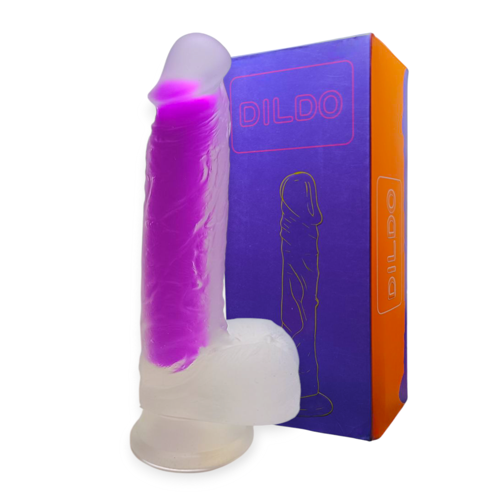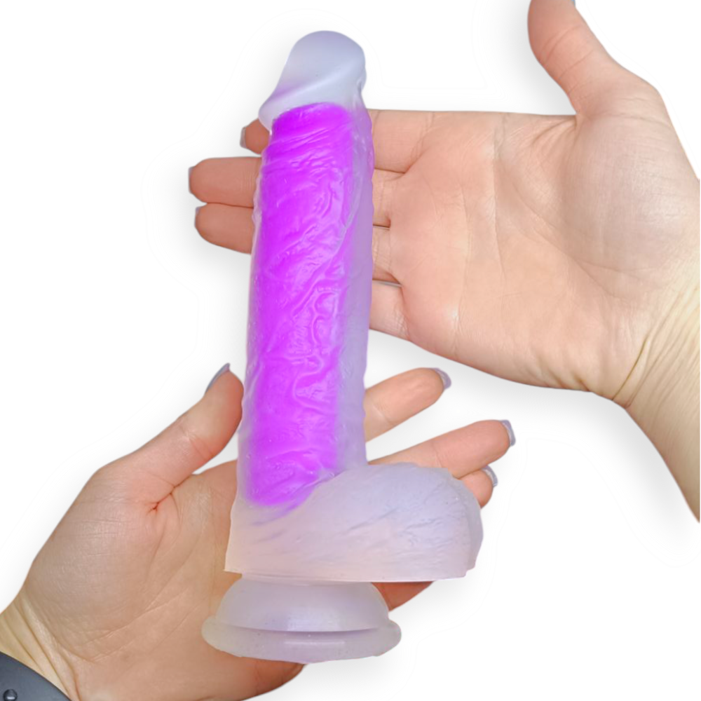 силикона в реалистичной форме мужского члена. Имеет полупрозрачный цвет а в стволе яркое фиолетовое наполнение. Благодаря этому наполнению складывается впечатление что фаллоимитатор светится, что добавляет ему ещё больше привлекательности. Материал напоминает матовое, бархатное напыление, очень приятный на ощупь. Внизу расположена реалистичная мошонка и мощная присоска, которую вы можете закрепить в любом горизонтальном или вертикальном положении.