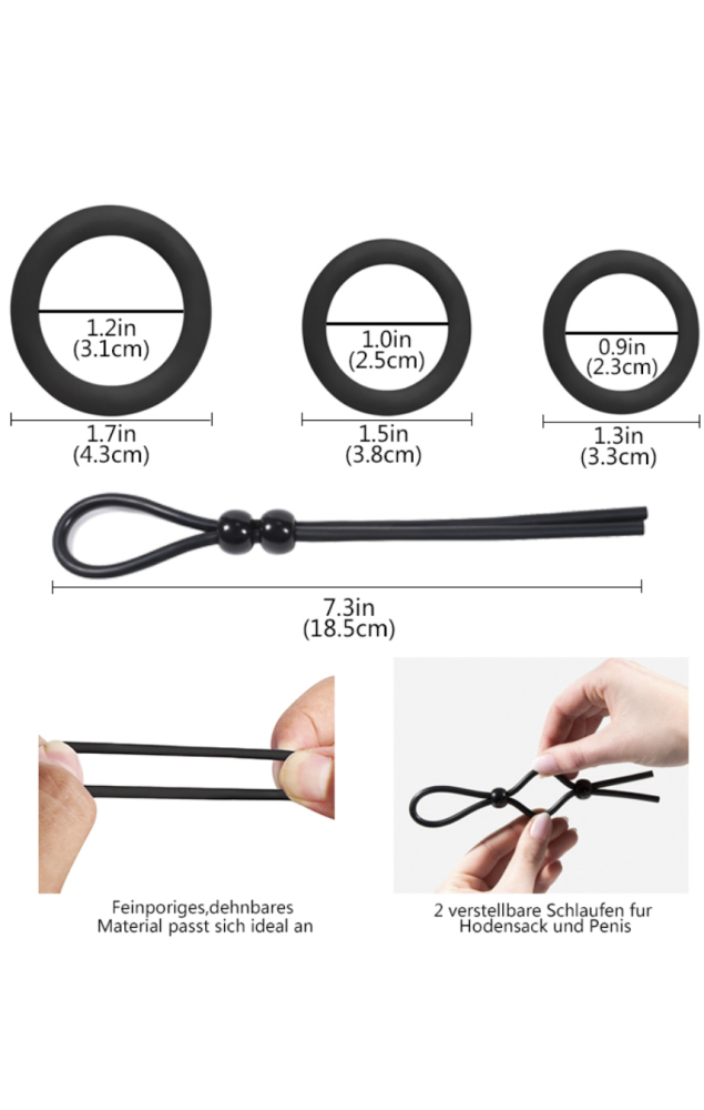 более крепкую и долгую эрекцию за счет того, что аксессуар сдавливает член и не дает крови покинуть его, а женщина может наслаждаться невероятно долгим половым актом, так как кольцо еще и не дает преждевременно кончить. При этом использовать игрушку до неприличия просто – наденьте ее на еще не возбужденный член, а когда наступит эрекция, наслаждайтесь эффектом. Набор колец от бренда Winyi идеально подойдет всем. Надевать на член можно только одно кольцо или несколько из них одновременно, в последнем случае ваша партнерша получит стимуляцию, как от рельефного фаллоимитатора и точно порадует вас стонами наслаждения. Материал колец – гипоаллергенный медицинский силикон, а пользоваться игрушками можно где и когда угодно, ведь им не нужны батарейки или зарядка, а предельно простая конструкция не боится воды. Для того, чтобы кольца легче надевались и снимались, пользуйтесь смазками на водной основе.