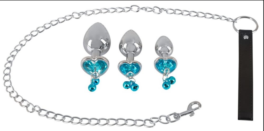 Тяжелая металлическая анальная эротика с лидерскими качествами! Набор из 3-х пробок с поводком от You2Toys с 3 пробками разных размеров и поводком с цепочкой. Каждая пробка имеет украшающую анус пробку в форме сердца, к которой прикреплены 2 звонких колокольчика и кольцо. Прилагаемый поводок-цепочка с карабином может быть прикреплен к кольцу для контроля и направляющих игр. Поводок-цепочка с кожаным ремешком на запястье. Алюминиевые пробки можно нагревать на водяной бане или охлаждать в холодильнике для еще более изысканных ощущений.
