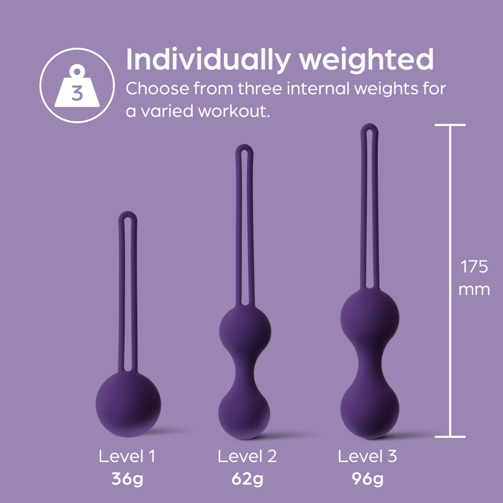 В отличии от многих других тренажеров Кегеля, набор вагинальных шариков So Divine Sensual Kegel Balls разработан в виде трехступенчатой системы из трех вагинальных шариков разного веса (36г, 62г, 96г), которые помогут пройти полный цикл тренировок от начального уровня до более продвинутого.