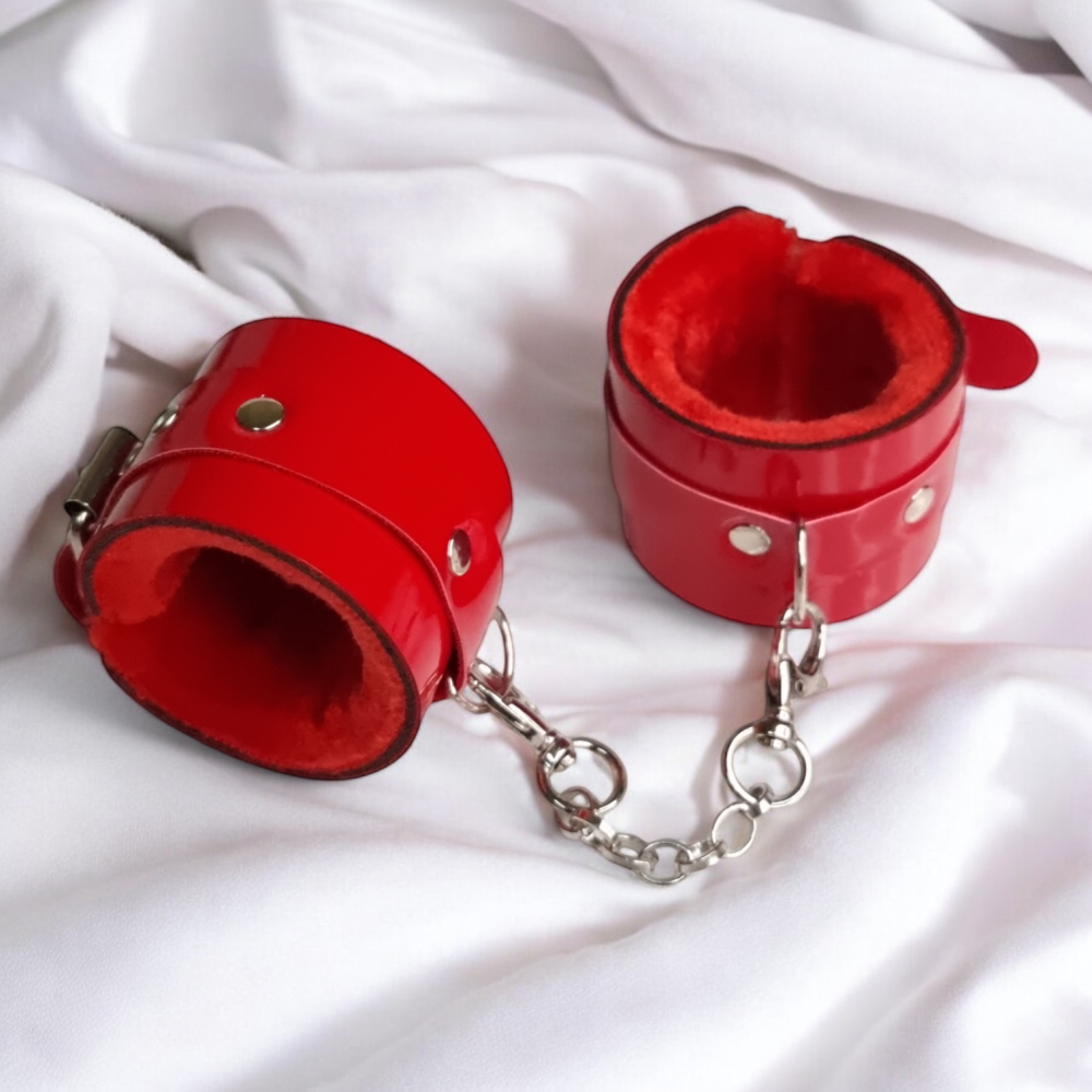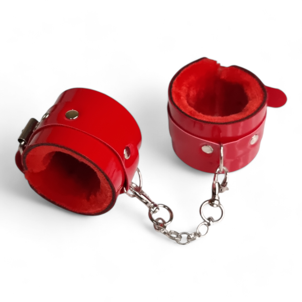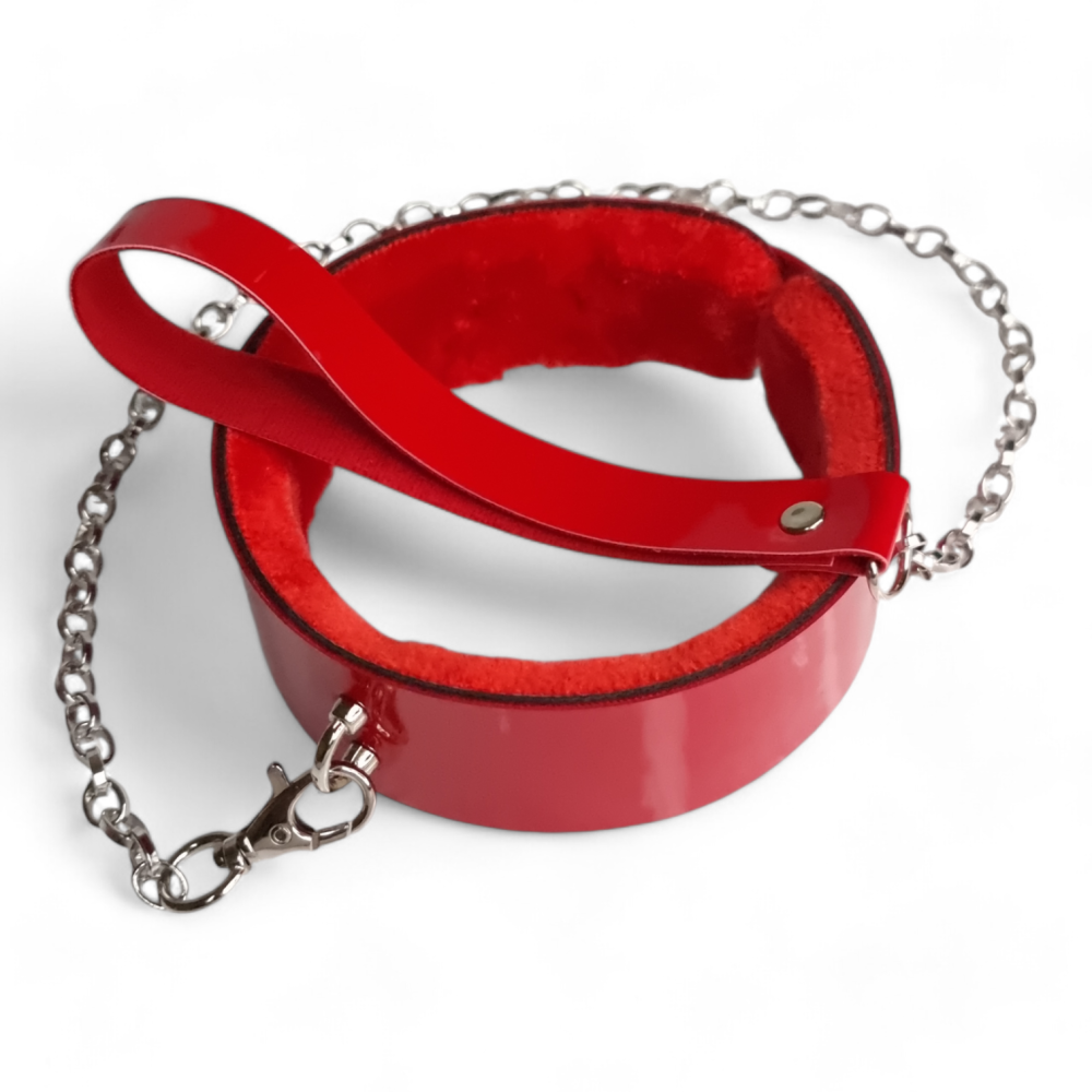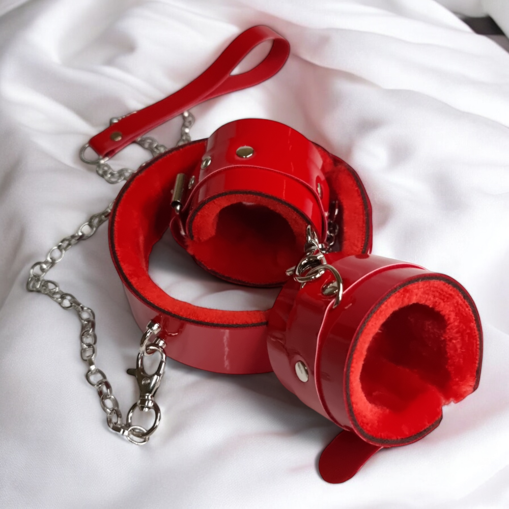 Комплект красные наручники + ошейник с поводком с красным мехом из ЭКО лака Flirty Этот комплект, изготовленный из премиальной эко кожи и украшенный деталями из нержавеющей стали, является идеальным выбором для тех, кто ценит высокое качество и уникальный стиль. Продуманный дизайн и внимание к деталям делают его не только практичным аксессуаром, но и изысканным дополнением к вашему образу. Ошейник и наручники являются символом подчинения в БДСМ-сексе, однако с помощью комплекта фиксаторов вы сможете продемонстрировать партнеру свою дерзость и строптивость даже в роли сабмесива. Оба фиксатора регулируются ремешками и пряжками, поэтому вы легко сможете подобрать необходимый размер в зависимости от обхватов запястья и шеи. На ошейнике предусмотрено кольцо по центру с помощью карабинов, вы можете закрепить поводок из комплекта. Универсальный аксессуар специально для любителей доминирования и подчинения, а также ограничения движений во время эротических утех.