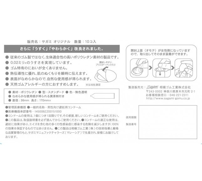 Презервативы Sagami Original 0.02 (2-го поколения) имеют толщину всего 0,02 мм и не содержат латекса. Эти презервативы изготовлены из полиуретана (PU) и поэтому также подходят для людей с аллергией на латекс.