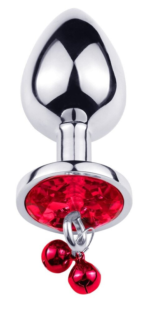 Анальная пробка среднего размера из нержавеющей стали. Пробка украшена красочным с кристаллом и колокольчиком.