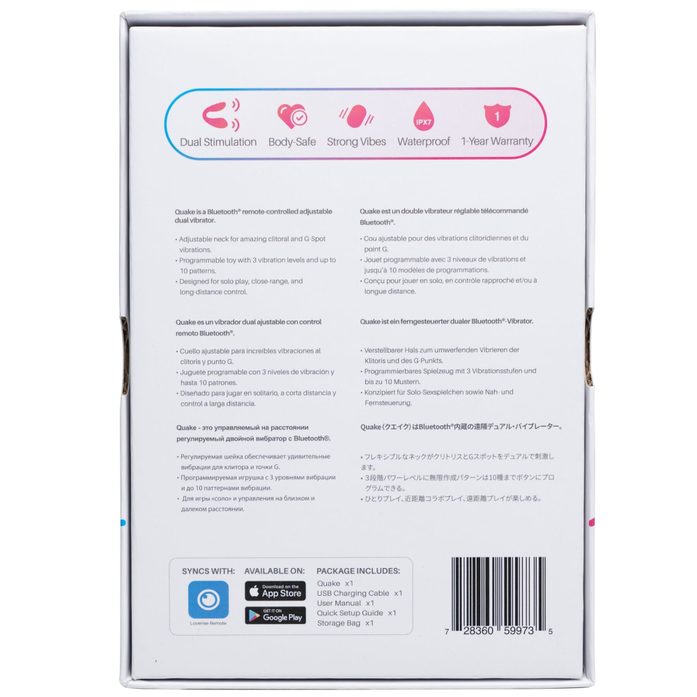 Двойной смарт вибратор Lovense Dolce (Quake) полностью водонепроницаемый (IPX7), так что его можно взять и в джакузи. Время работы вибратора до 120 минут, время зарядки 70 минут (во время зарядки будет гореть красный индикатор, который погаснет, когда вибратор зарядится). В комплекте атласный чехол.