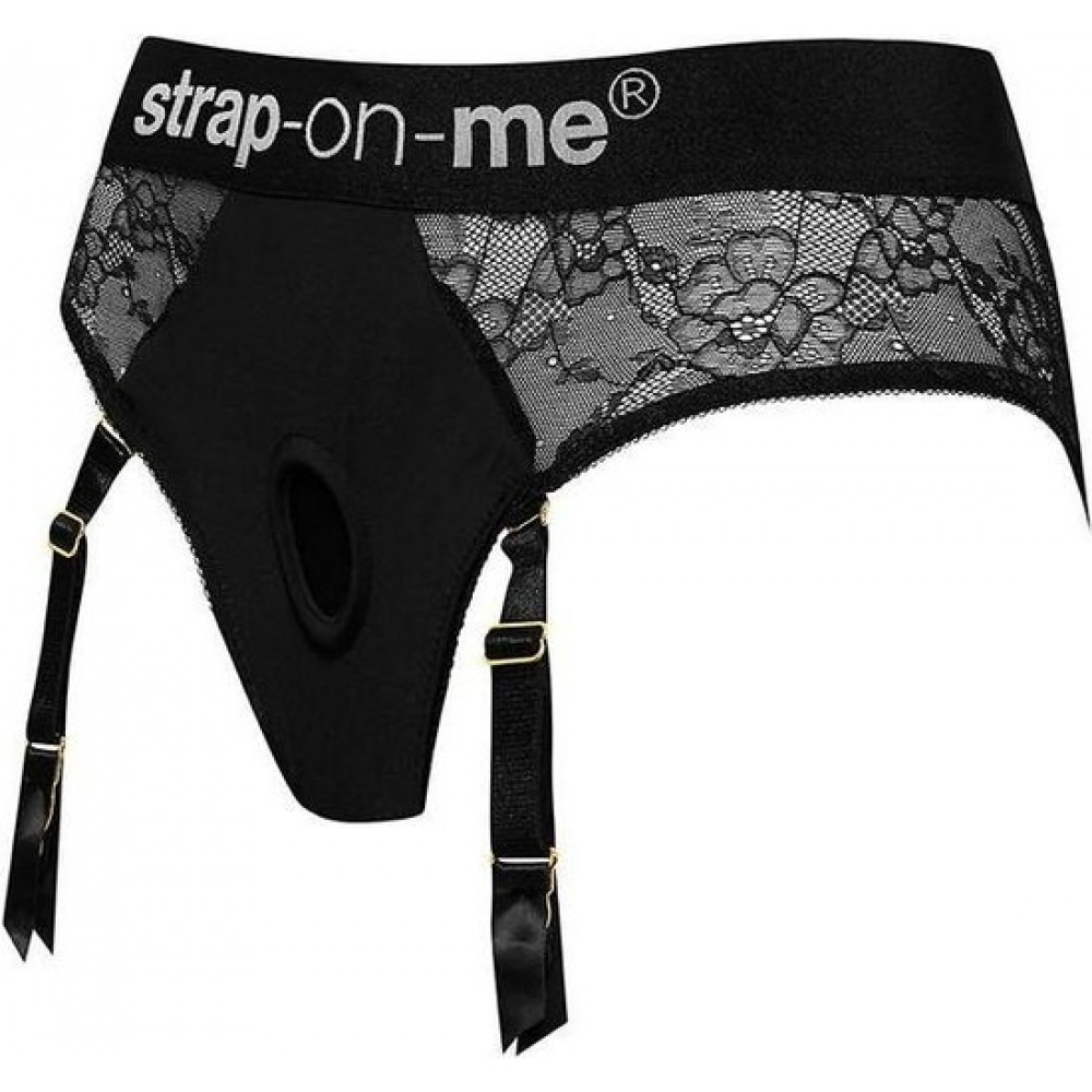 Трусики для страпона с пажами для чулок и кружевными вставками, черные, размер XL