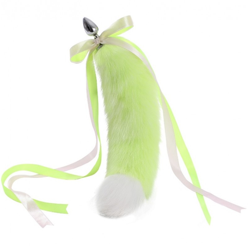 Анальний металевий затор з довгим хутряним хвостом Bicolor Fox Tail Plug салатовий Авокадо