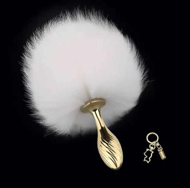 Металевий анальний затор з пухнастим білим заячим хвостиком.