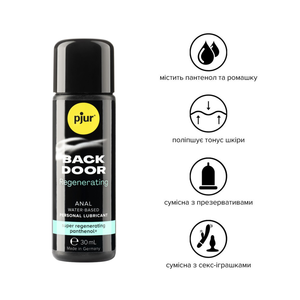 Лубрикант pjur Back Door Regenerating Anal Glide забезпечує тривале змащення, що робить його особливо придатним для боротьби з дискофортними відчуттями під час анального сексу. Також підходить для використання з еротичними іграшками.
