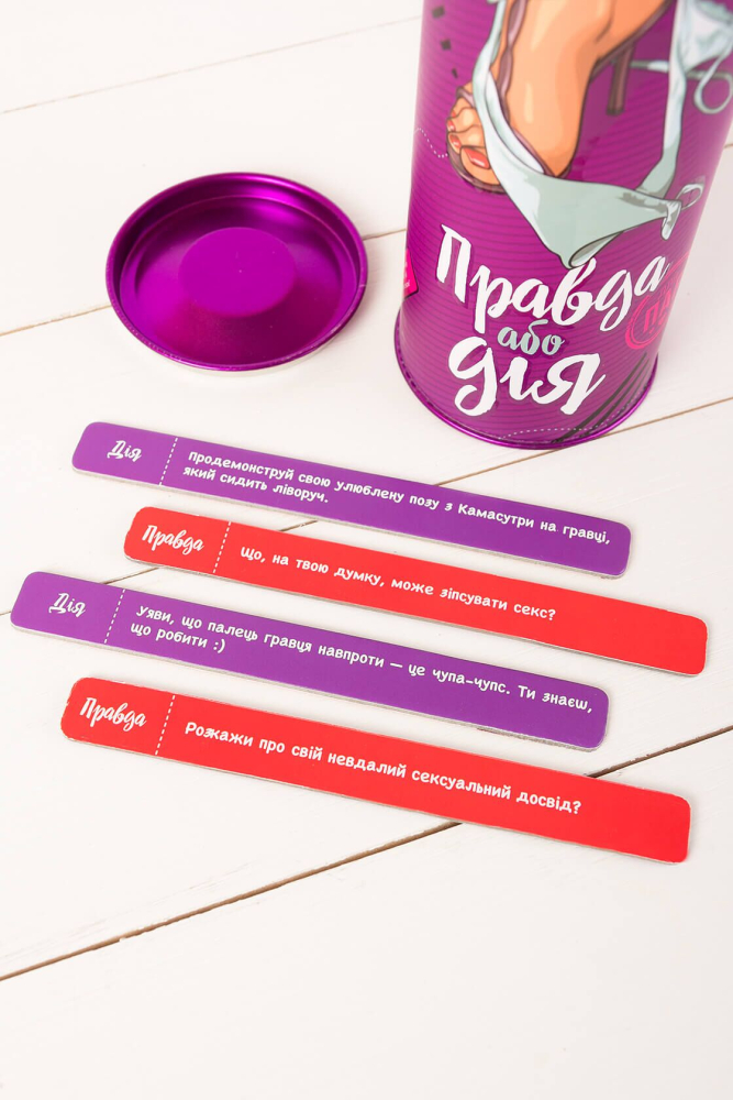 Думаете, что уже все перепробовали со своим партнером? Уверены? А ну-ка, бросьте вызов себе и вашей второй половинке. С «Правда або дія» вам предстоит узнать много нового о вашем партнере, а также проявить себя. А, возможно, вы сможете осуществить что-то, о чем в тайне давно мечтали, но стеснялись попросить. С нашей игрой вам не придется ничего придумывать - мы все уже придумали за вас=)