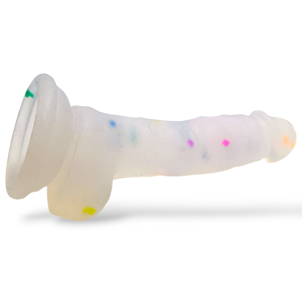 Яскравий та привабливий фалоімітатор, який може стати першим у вашій колекції у секс-іграшок. Його оригінальний колір і невеликий розмір, безумовно, притягають погляд. Фалоімітатор виконаний у реалістичній формі з виразною головкою та невеликою мишечкою. Внизу секс-іграшки розташована міцна присоска, яку можна кріпити до будь-якої рівної поверхні. Матеріал фалоімітатора приємний на дотик і нагадує матовий та оксамитовий. Усередині фалоімітатора проглядаються дрібні конфетті, що створює враження свята та веселощів. Використовуйте лише з лубрикантом на водній основі. Перед та після використання обробляйте спеціальним спреєм для інтимних виробів. Загальна довжина 177 мм. Робоча довжина 125 мм. Діаметр 30 мм. Колір: напівпрозорий Упаковка коробка