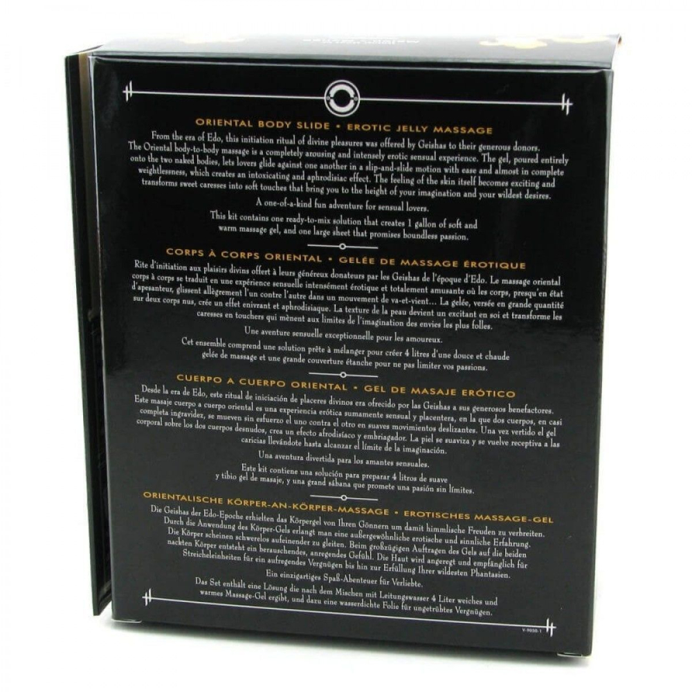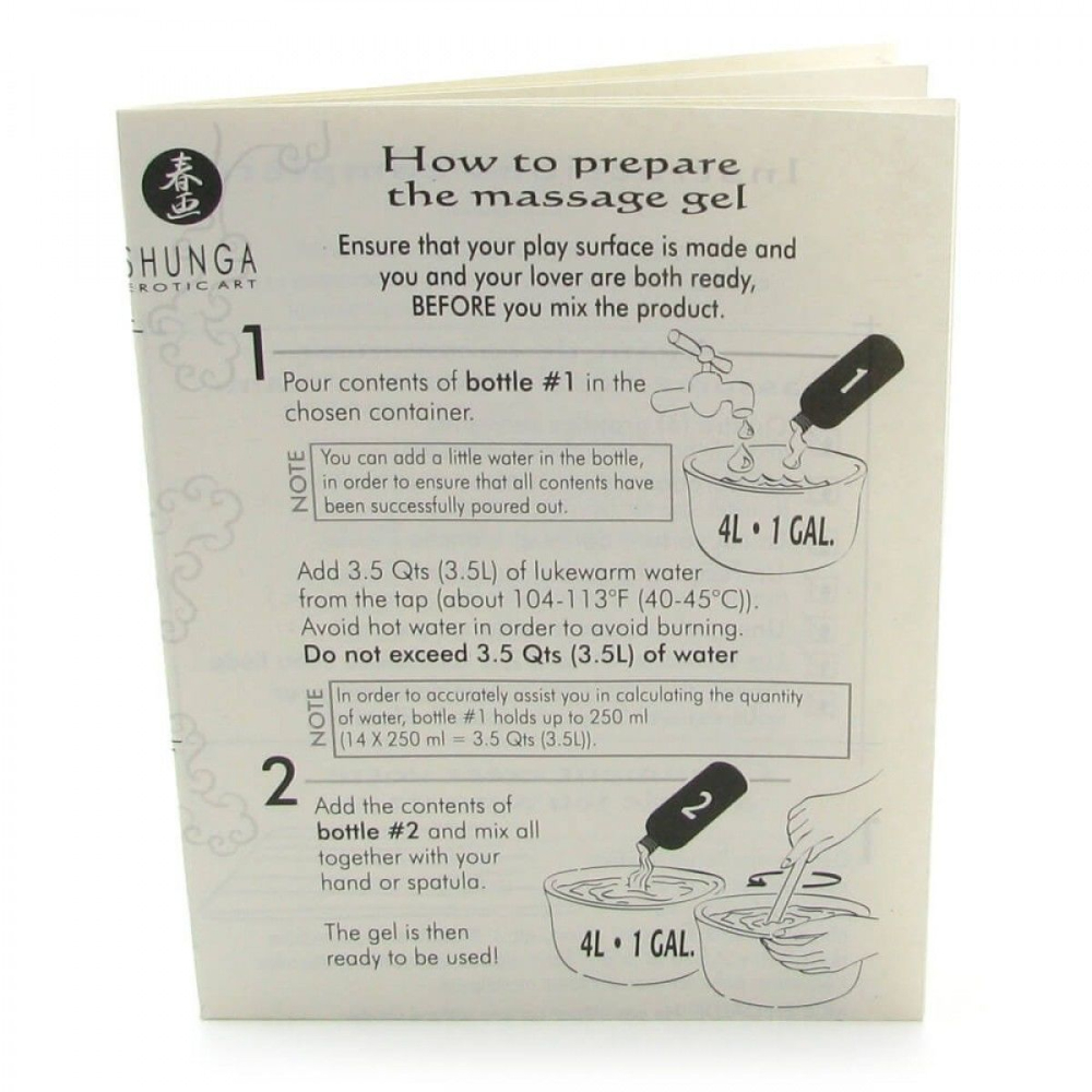 Для приготування суміші вам буде потрібно 3,5 літра теплої води, з яких вийде 4 літри гелю. По черзі вилийте туди обидва флакона з набору і добре перемішайте. Вуаля! Густий, неймовірно ароматний гель для любові готовий. Скачайте 4 невисоких валика з ковдр або пледа і розподіліть по краях ліжка. Має вийде подобу невисоких бортиків. Це потрібно для того, щоб під час процесу гель не розтікався, підтримуючи постійне ковзання. Поверх розстеліть Золоте покривало і запрошуйте партнера випробувати незабутнє задоволення, яке запам'ятається Вам надовго.