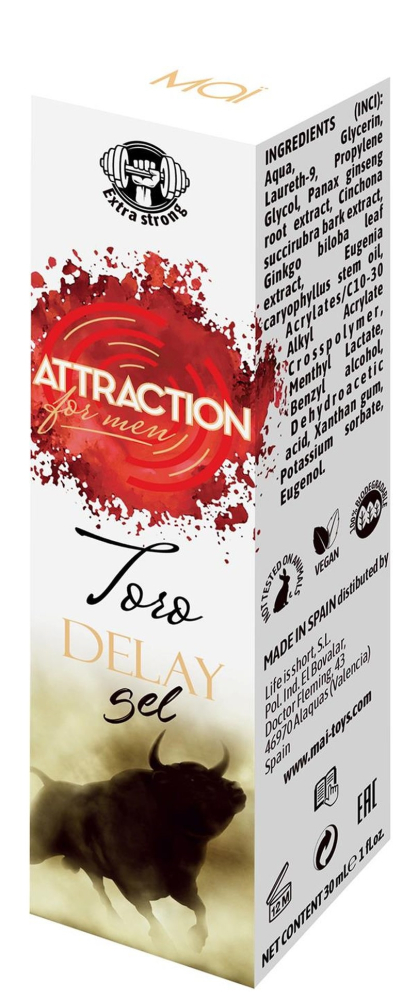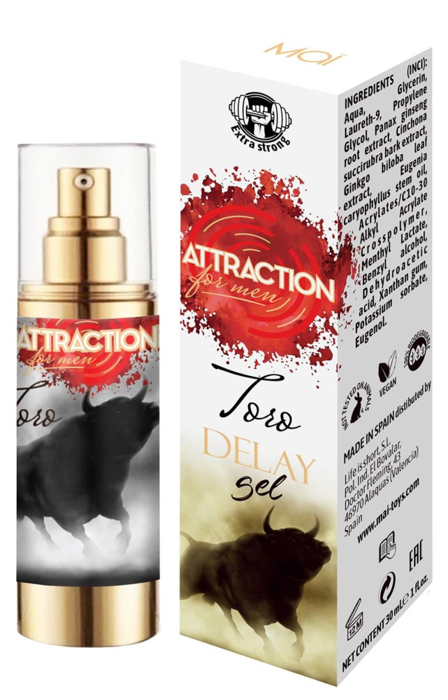 Toro Delay Gel - це продукт, призначений для покращення чоловічої сексуальної активності та забезпечення тривалого та максимального задоволення під час статевого акту завдяки безпечним, натуральним інгредієнтам. Mai Cosmetics протягом багатьох років орієнтується безпосередньо на потреби своїх клієнтів і тепер розробила 100% натуральний продукт, який не містить ні лідокаїну, ні бензокаїну для відновлення фізичного здоров'я чоловіків. Завдяки ретельному контролю якості, що здійснюється безпосередньо на виробництві, та повній повазі потреб клієнтів та навколишнього середовища, частиною якої ми є, Mai Cosmetics вийшла за рамки продукту, створивши 100% екологічну упаковку. Новий Toro Gel - ідеальний продукт для чоловіка-переможця, який перебуває в гармонії з собою та всім навколо. Цей гель Toro Delay з дуже сильною формулою повністю заснованої на натуральних екстрактах підтримує нейтральний pH шкіри. Серед інгредієнтів лаурет-9, екстракт червоного хінного дерева та олію гвоздики, які працюють синергетично, модулюючи чутливість чоловічого статевого органу, затримуючи еякуляцію, продовжуючи задоволення і відновлюючи природність чоловічої сутності в організмі, для тривалого ефекту. Цей продукт не тестувався на тваринах, містить лише рослинні інгредієнти та виробляється в ЄС. Веганський і 100% біорозкладається.