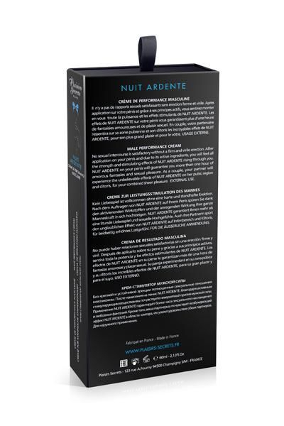 Крем для підтримки ерекції Plaisirs Secrets Male Performance Cream Nuit Ardente (60 мл) - при нанесенні на пеніс ви відчуєте неймовірний приплив чоловічої сили. Застосування крему забезпечує більше години сексуальної насолоди і сексуальних фантазій, крім того ваша партнерка так само відчує збудливий ефект в області клітора, що посилить задоволення обох партнерів.