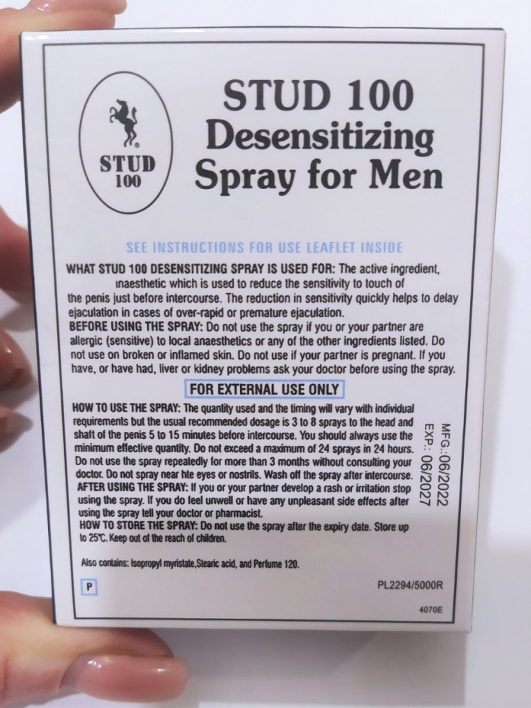 Швидкодіючий STUD 100 (репліка) затримує еякуляцію шляхом тимчасового зниження чутливості статевого члена. Він містить широко використовуваний місцевий анестетик лідокаїн (в процентному співвідношенні 9,6%). STUD 100 (репліка) не токсичний, не має запаху, не руйнує озоновий шар.