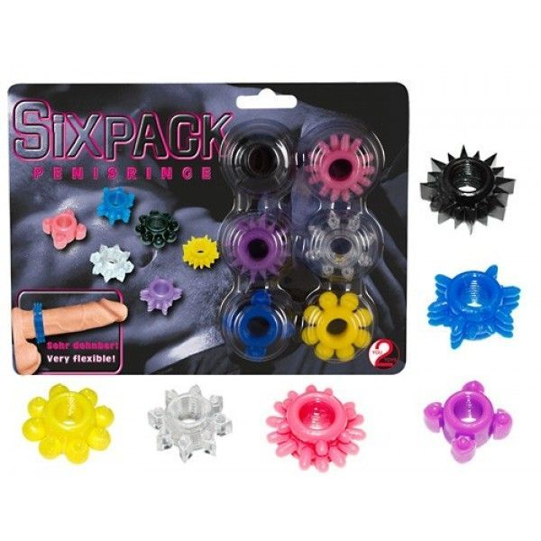 економічний набір, який складається відразу з шести ерекційних кілець в одній упаковці. будь-яке з кілець, можна надіти на підставу чоловічого статевого органу, тим самим значно посиливши ерекцію і продовживши статевий акт. крім того, якщо надіти відразу всі кільця - вийде відмінна насадка для вагінального проникнення. кожне з кілець має текстурований рельєф, що забезпечує додаткову і яскраву стимуляцію під час статевого акту.кільця виконані з безпечного для тіла матеріалу, який не містить фталатів, не має запаху і простий у догляді. кожне з кілець дуже еластично і підходить для будь-яких розмірів.