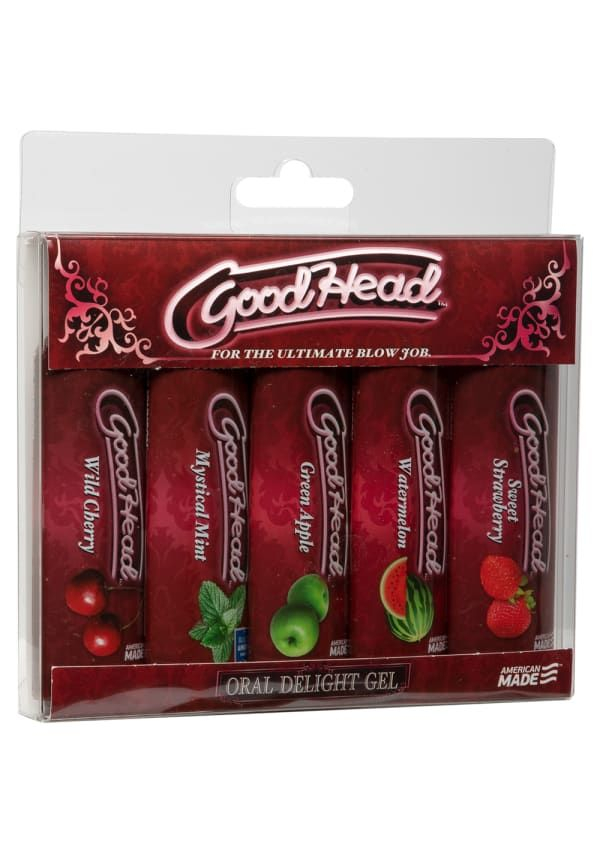 Ніжний смачний гель тепер не тільки освіжає подих, але і робить мінет максимально приємним для обох учасників процесу! Рекомендуємо купити лубрикант-гель для орального сексу Doc Johnson GoodHead, набір 5х29мл-відразу 5 упаковок з різними смаками під будь-який настрій: полуниця, вишня, кавун, м'ята і яблуко! Без цукру і парабенів, нелипкий і дуже густий, цей гель полегшує ковзання під час мінету і ніжно обволікає горло для максимально приємних відчуттів.