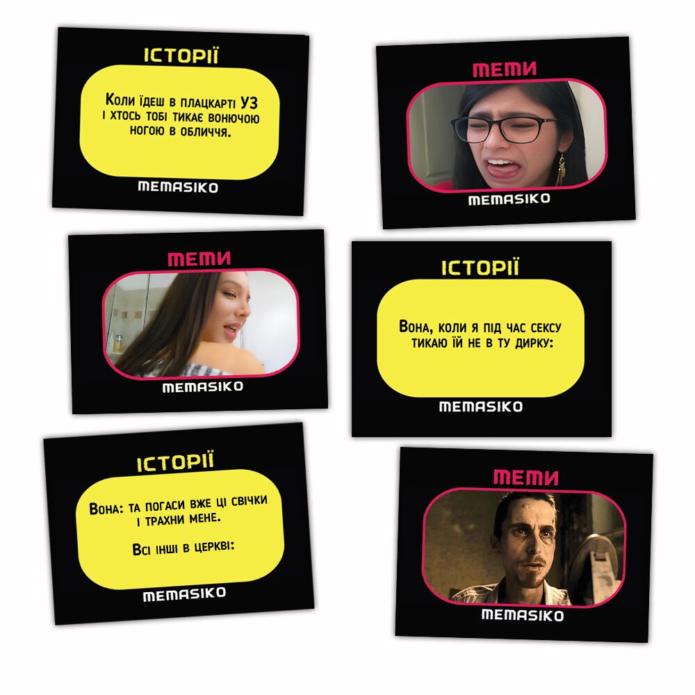 Розважальна гра про мем на різну тематику без цензури. Карти поділені на дві категорії: меми та смішні історії. Завдання гравців - підібрати найсмішніші комбінації і весело провести час. Теми історій та меми підібрані найбільш актуально та пов'язані із сучасними реаліями.