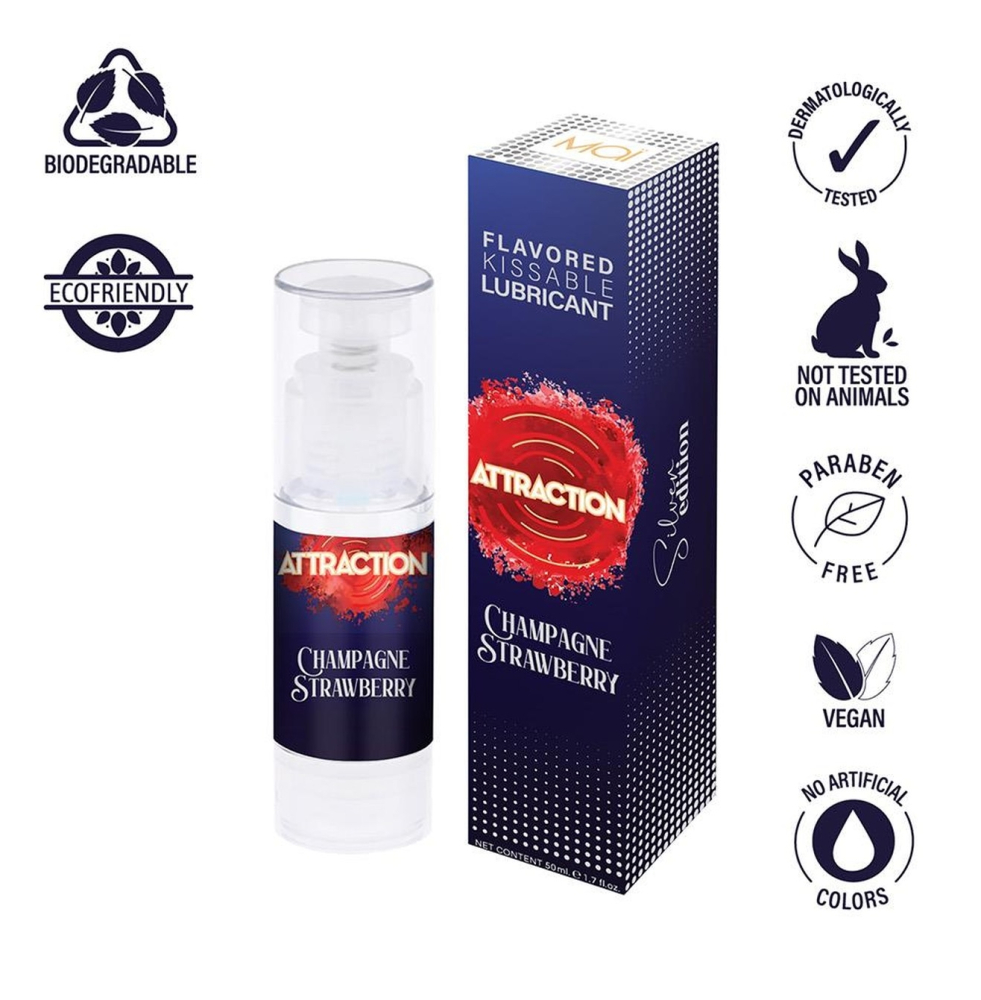 Ароматизований лубрикант Attraction Flavored Kissable Lubrikant «Шампанське та Полуниця». На водяній основі. Без синтетичних ароматів та барвників. На смак, як справжній! Attraction Flavored Kissable Lubrikant - відмінний спосіб познайомити з оральним сексом партнера, який може бути трохи вагається. Нанесіть кілька крапель мастила на свої ерогенні зони і запропонуйте партнеру досліджувати їх одну за одною. Водорозчинні / біорозкладні: ароматизовані мастила Attraction Flavored Kissable Lubrikant створені на водній основі. Ці формули м'яко впливають на чутливу шкіру та забезпечують тривалу шовковистість. Ці мастила безпечні для латексу, легко змиваються теплою водою та безпечні для використання з усіма типами іграшок. Без цукру та глютена: ароматизовані мастила Attraction Flavored Kissable Lubrikant не містять цукру, глютена або барвників. Ці смачні ласощі на смак як справжні, без штучного смаку. MAI Attraction Flavored Kissable Lubrikant не містить парабенів.