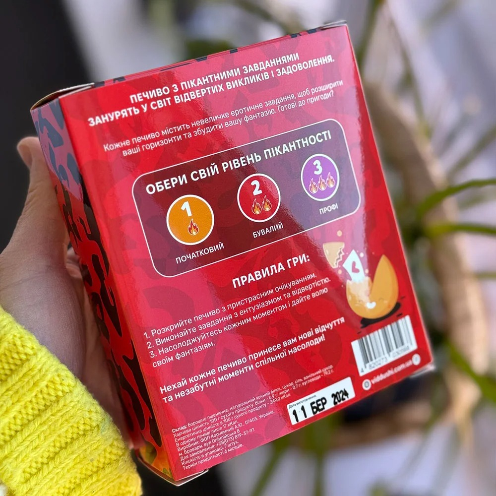 Кожне печиво містить несподівані завдання, які допоможуть вам освіжити ваші стосунки та відкрити нові обрії у сексуальному житті. Від ніжних масажів до захоплюючих еротичних ігор – наше печиво створено, щоб підняти ваші вечори на новий рівень пристрасті та задоволення.