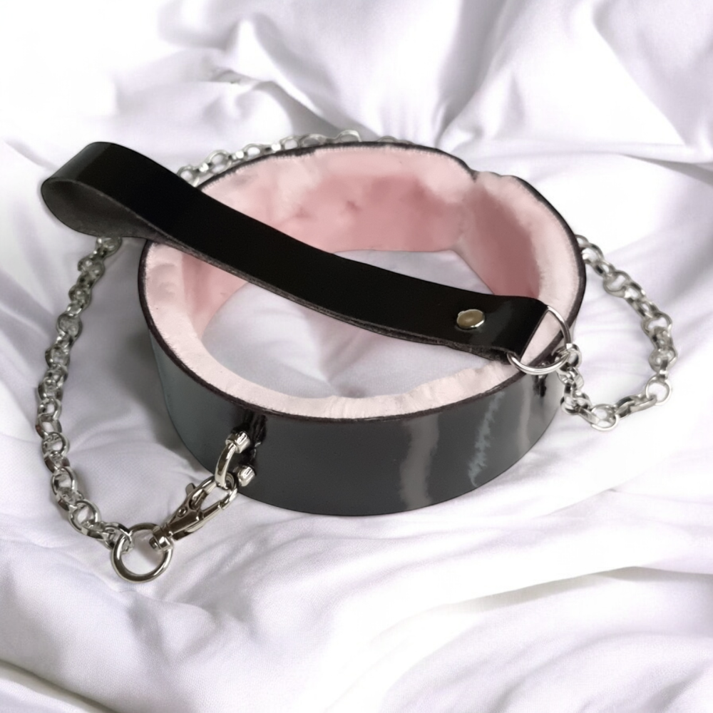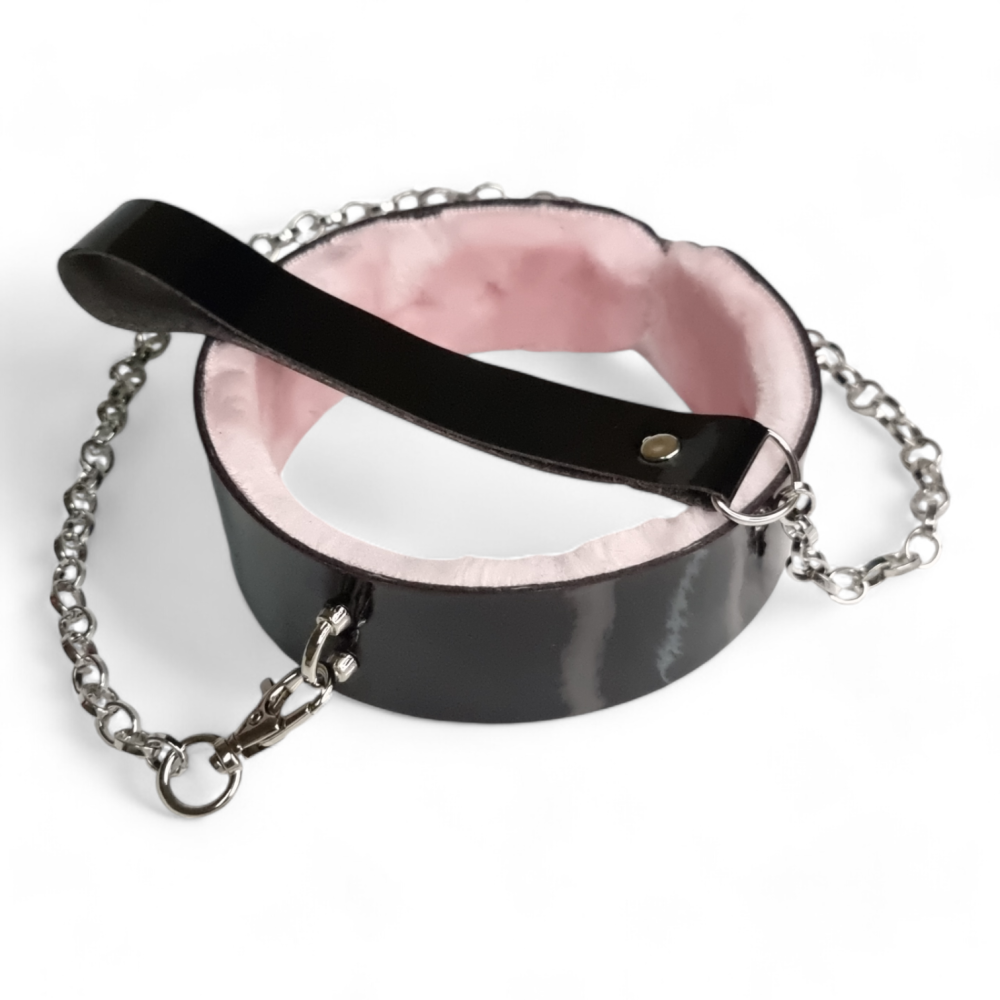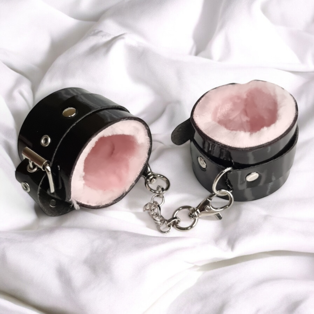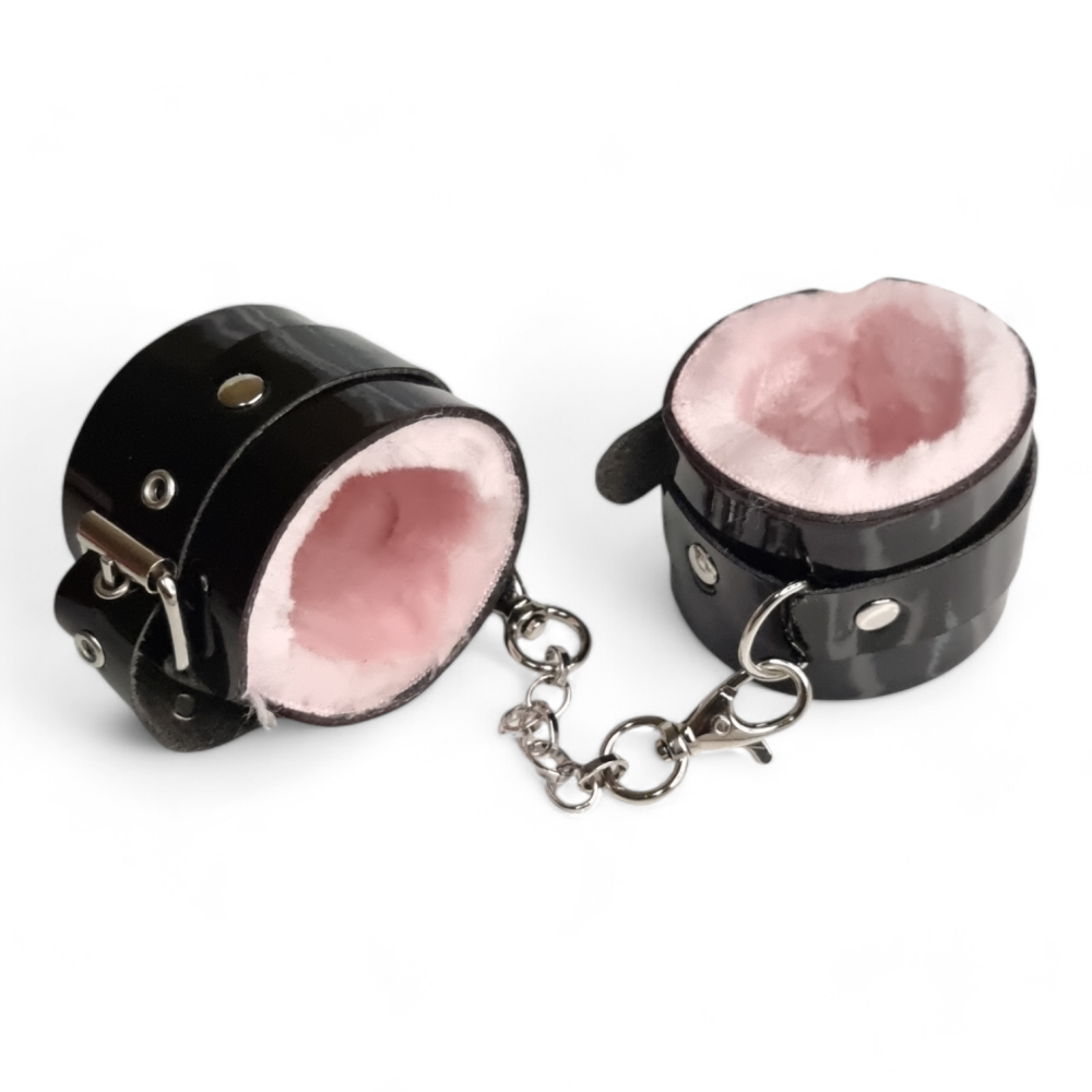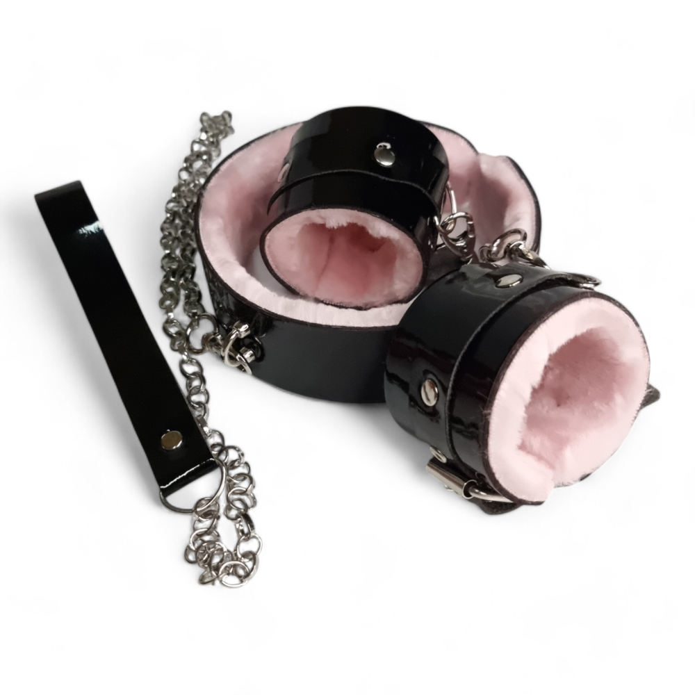 Комплект чорні наручники + нашийник з повідцем з рожевим хутром з ЕКО лаку Flirty Цей комплект, виготовлений із преміальної еко шкіри та прикрашений деталями з нержавіючої сталі, є ідеальним вибором для тих, хто цінує високу якість та унікальний стиль. Продуманий дизайн та увага до деталей роблять його не тільки практичним аксесуаром, а й вишуканим доповненням до вашого образу. Нашийник і наручники є символом підпорядкування в БДСМ-сексі, проте за допомогою комплекту фіксаторів ви зможете продемонструвати партнеру свою зухвалість і норовливість навіть у ролі сабмесива. Обидва фіксатори регулюються ремінцями та пряжками, тому ви легко зможете підібрати необхідний розмір залежно від обхватів зап'ястя та шиї. На нашийнику передбачено кільце по центру за допомогою карабінів, ви можете закріпити повідець з комплекту. Універсальний аксесуар спеціально для любителів домінування та підпорядкування, а також обмеження рухів під час еротичних розваг.