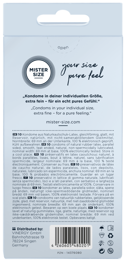 Презервативи німецького виробника Mister Size (Містер Сайз) є веганськими. Темно синя смуга на передній частині упаковки дорівнює ширині пеніса під який зроблений презерватив. Розмір 69 рекомендується для окружності пеніса від 14 до 15 см.ви знайдете свій розмір в наших презервативах. 69-й розмір у продажу в упаковках по 3шт, 10шт і 36шт.