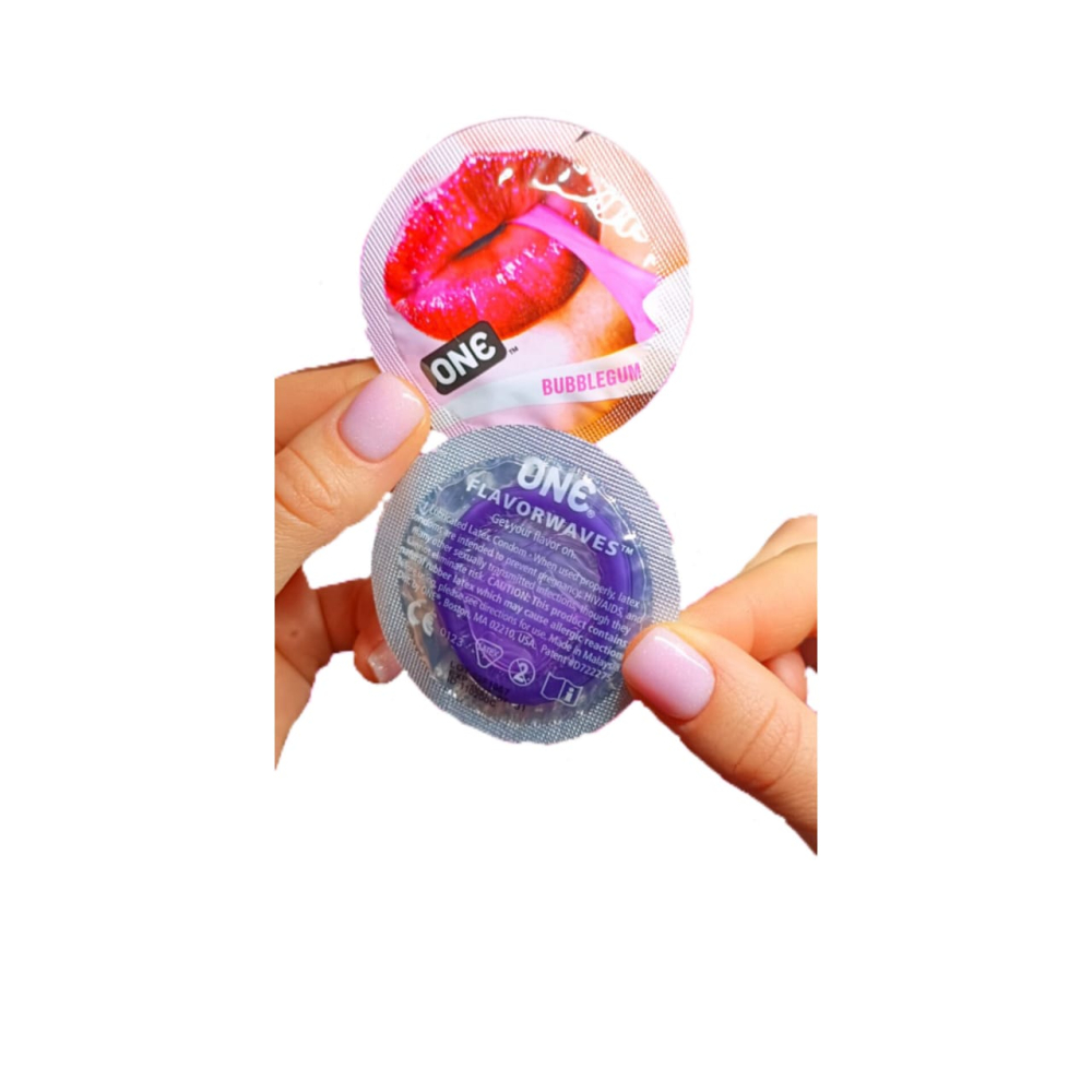 Презервативи ONE Bubblegum-ароматизовані презервативи класичної форми в стильній упаковці з дуже ніжним і приємним ароматом (смаком) жувальної гумки. Зроблені з латексу високої якості і містять силіконову змазку. Кожен презерватив проходить перевірку на міцність і надійність і відповідає міжнародним стандартам якості. ONE Bubblegum-це чутливість, надійність і незабутній аромат!