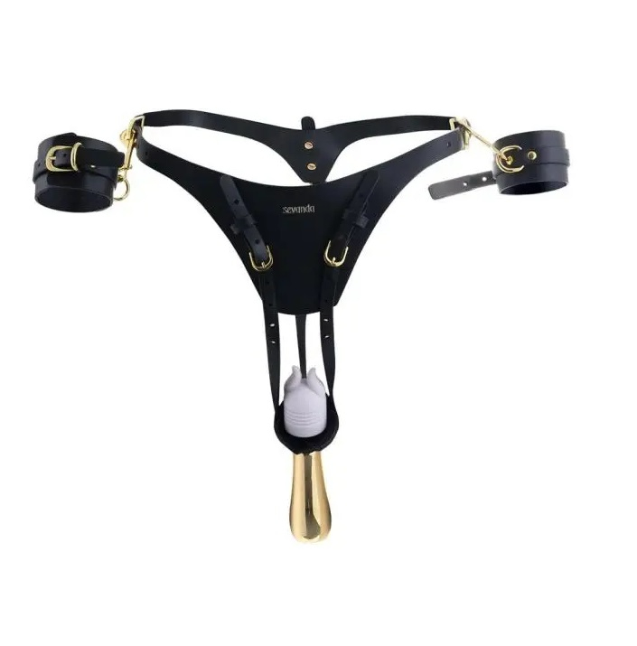 Характеристики Ремінний страпон з вібрацією та 2 насадками золотистого кольору з пультом ДУ Lockink Sevanda Авокадо