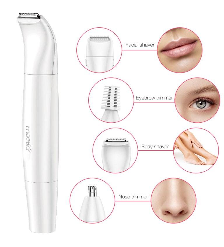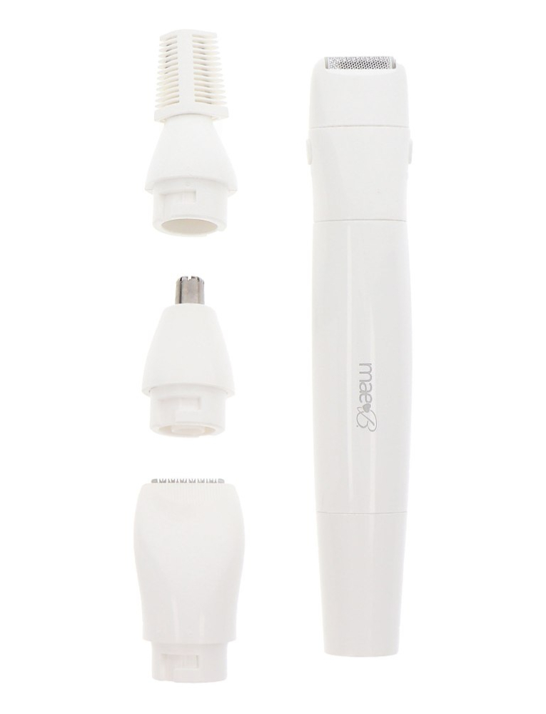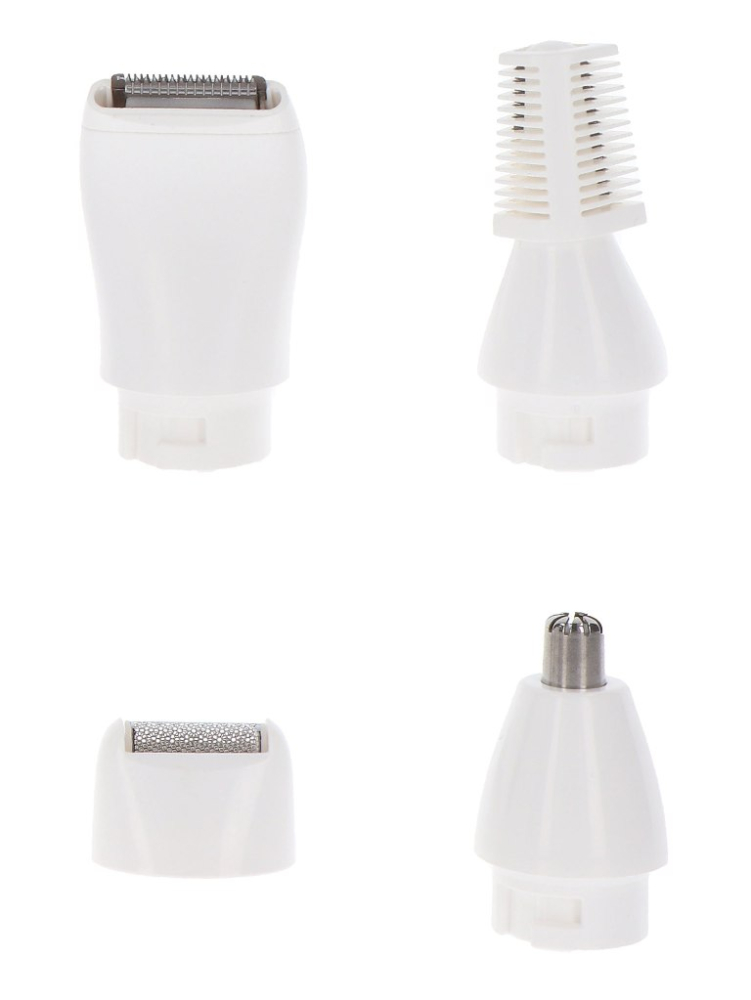 "Все в одному" - точно підстригте волосся на обличчі та тілі за допомогою "Все в одному" від Мей Б. Ергономічна ручка забезпечує оптимальний контроль та комфорт при використанні. Гострі, гіпоалергенні леза з нержавіючої сталі ефективно та безпечно видаляють волосся на обличчі та тілі. Все в одному жіноче бритво включає в себе повний набір з чотирма різними головками підстрижки та шафку для зберігання, щоб зберегти пристрій та аксесуар у безпеці. Специфікації: