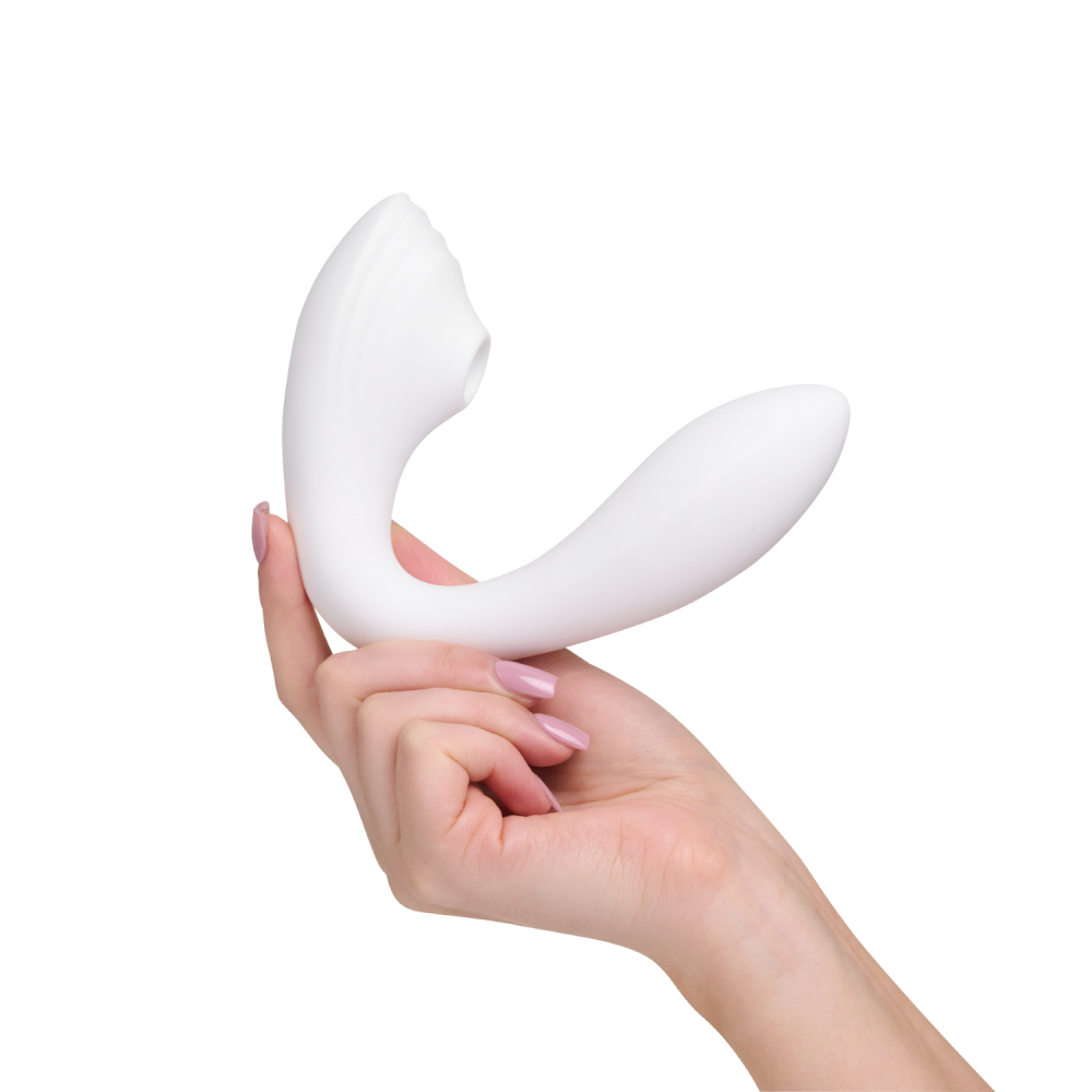Іграшка поєднує вакуумні стимуляції клітора (11 режимів) та внутрішні вібрації в зоні G (7 режимів). Має 3 швидкості. Дбайливо підлаштовується до вигинів вашого тіла завдяки гнучкому внутрішньому стимулятору.