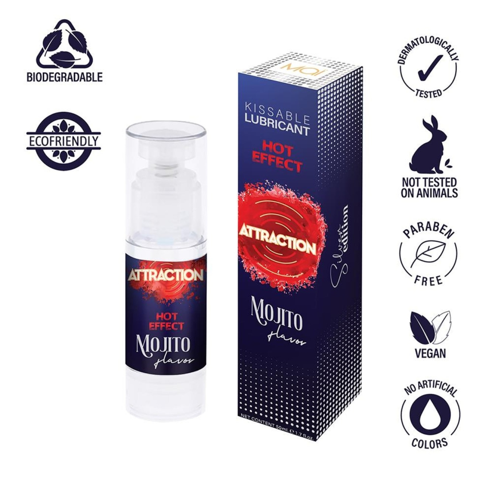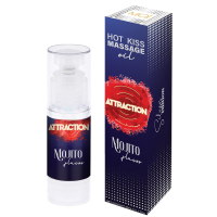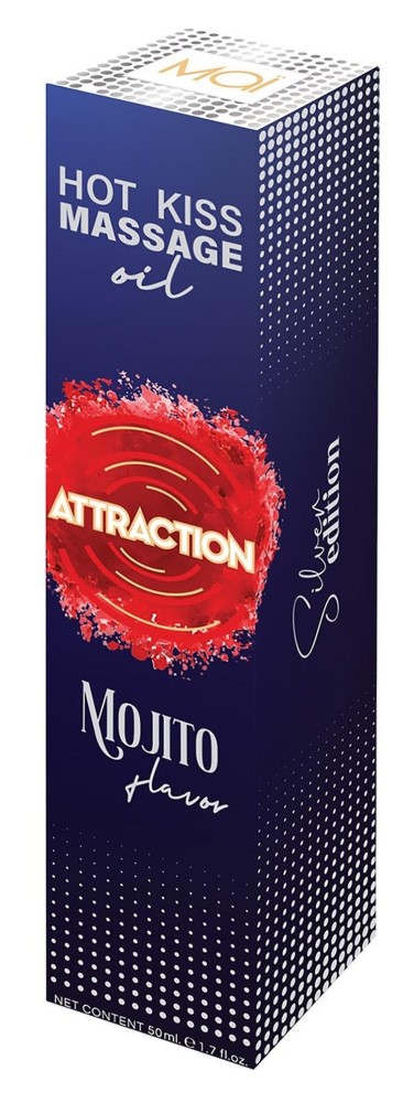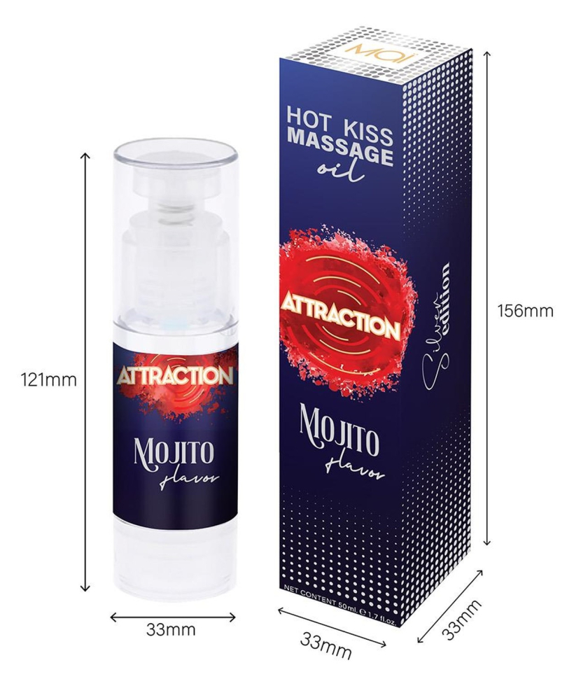Attraction Hot Kiss Massage Oil - гарячий ефект зі смаком мохіто обов'язково зігріє стосунки між статями! Наша веганська, безпечна для тіла формула створена для інтимної прелюдії та орального задоволення. Цей освіжаючий коктейль з прохолодної м'яти, пряного лайма і легкої насолоди дарує ніжне відчуття, що зігріває при нанесенні на інтимні зони.