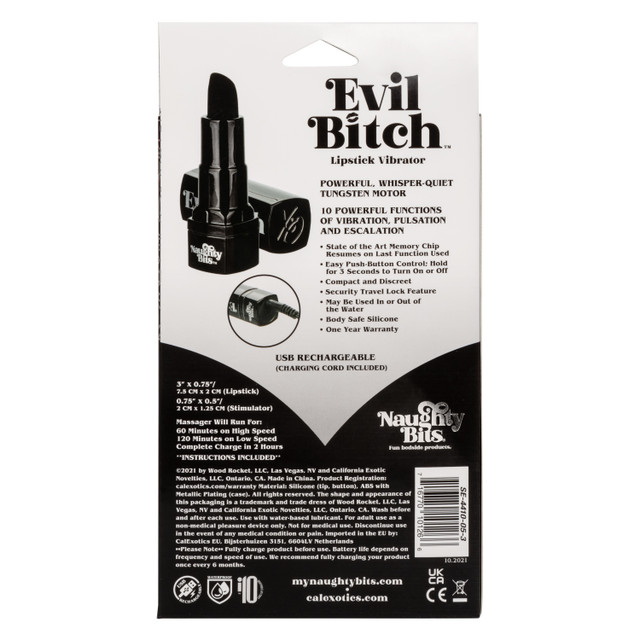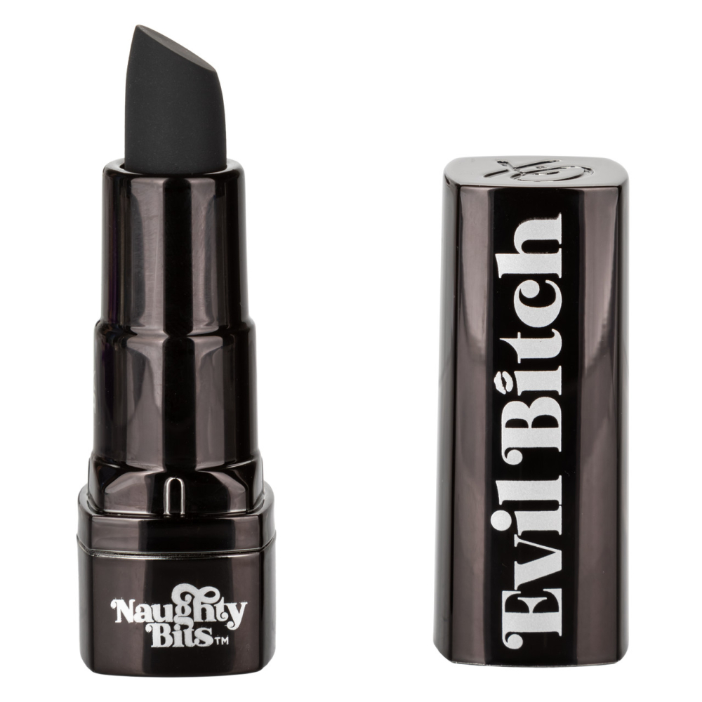 Обережно, вібратор для губної помади Naughty Bits Evil Bitch - бешкетний і приємний. Зухвалий дизайн у вигляді чорної помади, 10 потужних функцій вібрації та безшумний вольфрамовий двигун створені для того, щоб тішити вас, куди б ви не подалися.