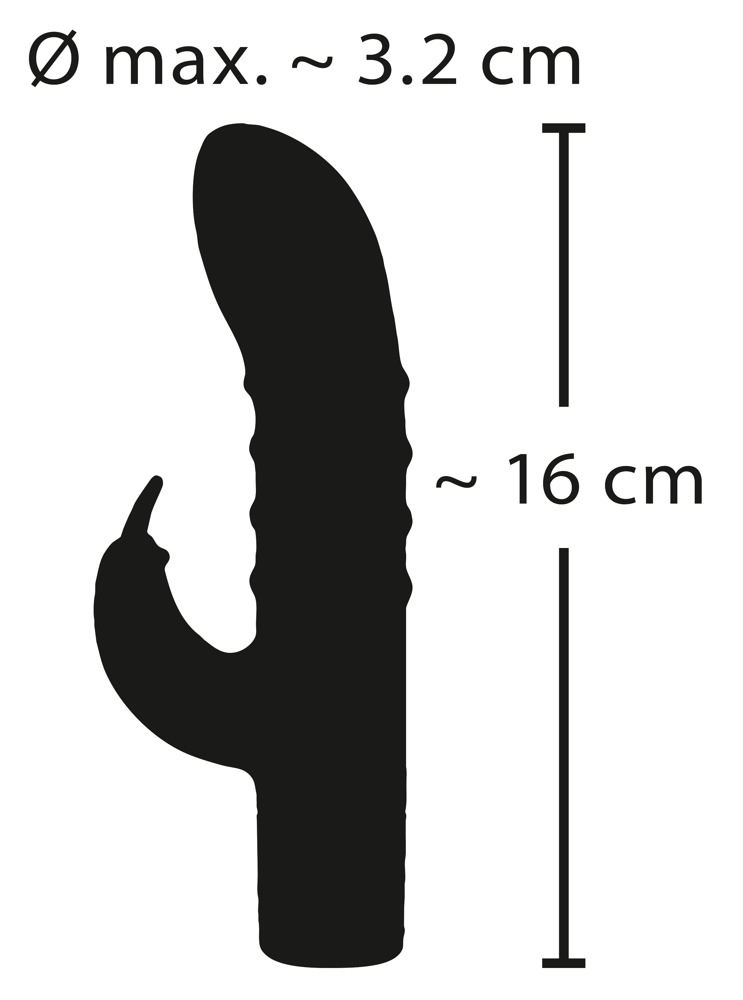Маленька електростанція для подвійного насолоди! Зручний вібратор Rabbit Vibe із серії Elegant із кліторальним стимулятором для одночасної вагінальної та кліторальної стимуляції. 15 режимів вібрації забезпечують подвійну стимуляцію найрізноманітнішого задоволення. Завдяки практичному однокнопковому управлінню режими можна зручно регулювати одним натисканням кнопки. Вібратор виконаний з м'якого силіконового матеріалу по всій поверхні та забезпечує дуже приємні відчуття на шкірі під час ласк. Оскільки вібратор водонепроникний, ніщо не завадить віброзадоволенню навіть під водою (у ванні чи душі). Завдяки своїм помірним розмірам ця маленька електростанція міститься практично в будь-якій кишені - ідеальний варіант для подорожей та поїздок. Перезаряджається - USB-кабель для заряджання входить у комплект. Загальна довжина 16 см. Глибина запровадження 9,9 см. Ø 3,2 см. Силікон, поліуретан, ABS.