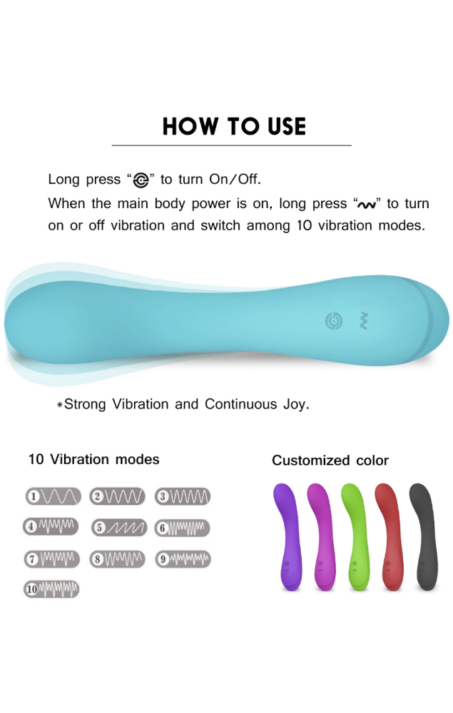 Якщо один вид цього вібратора не викличе у вас бажання якнайшвидше ввести його у піхву, то після першого ж використання іграшки ви точно не зможете встояти перед її зачаруванням. Плавно згинається корпус з кінцем, що злегка потовщується, дуже легко проникає всередину, вже на цьому моменті починаючи приносити задоволення, а якщо ви натиснете на кнопку на ручці, то потужна вібрація пронизує все тіло і викличе неконтрольований стогін насолоди. До ваших послуг цілих 10 режимів роботи вібратора, тому доводити себе до оргазму ви зможете повільно або швидко, залежно від настрою. Не секрет, що багато жінок люблять користуватися вібратором у ванній, і ця модель чудово підходить для таких цілей. М'який медичний силікон не пропустить ні краплі води всередину іграшки, а його дотику до інтимних зон вашого тіла не викликають подразнення. А для максимально ніжного та м'якого проникнення з іграшкою можна використовувати лубрикант на водній основі.