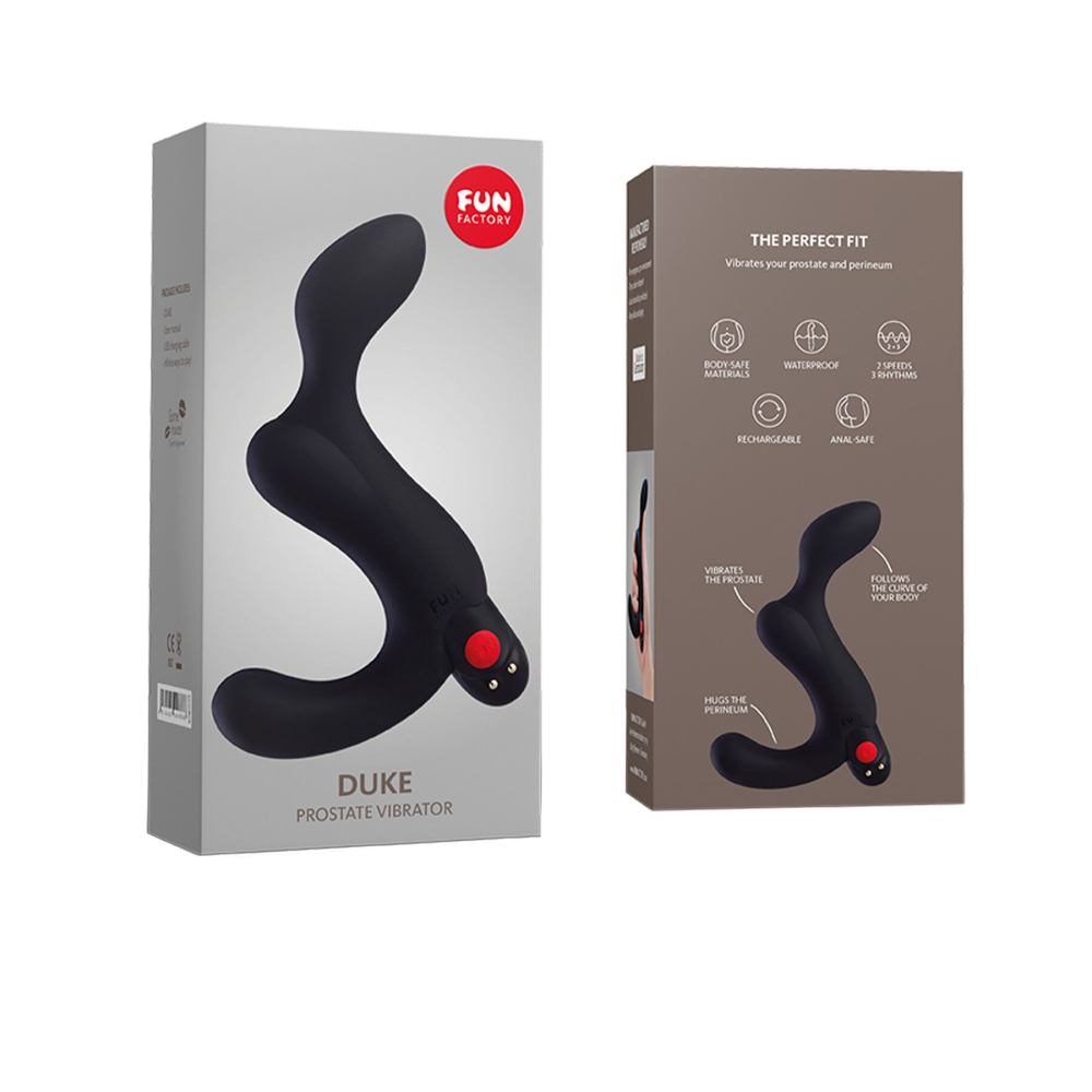 Дизайн масажера простати Fun Factory DUKE спеціально розроблений з додатковим вигином, зверненим назад - у той час, коли передня опуклість стимулює простату, вигин назад створює відчуття наповненості, що не передається.