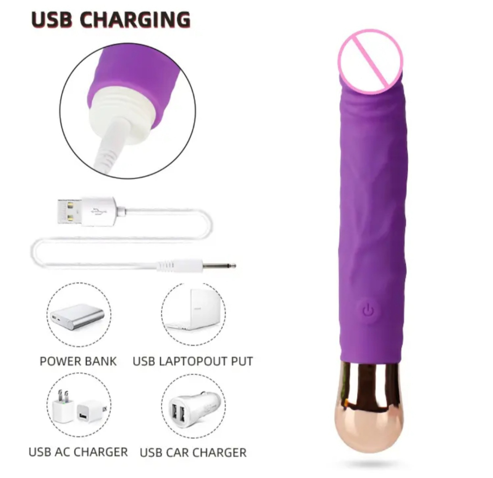 идёт в комплекте. Прежде чем вставить шнур открутите золотистую крышку внизу рукоятки- там и спрятан вход для зарядки. Крышка плотно закрывает USB вход и делает данный вибромассажёр водонепроницаемым.